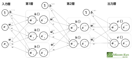 - [第1層]:パラメーターと入力から、第1層の出力を計算します。行列計算をしてシグモイド関数で計算しています。