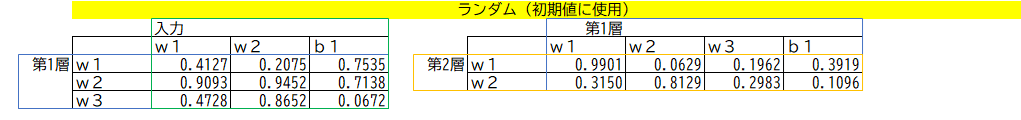 入力・第1層・第2層の出力は、最初のパラメーターは適当に入力する必要があります。そこで、エクセルのRND()関数をつかって、初期パラメーター を準備しておきます。