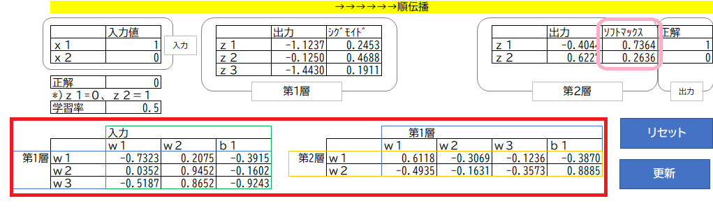 更新を押すと、正解の方のソフトマックスの値が1に近づいていきます。(ピンクの枠線)ここで重要なのは、赤枠のパラメーターが変更されている点です。