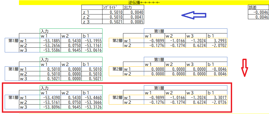 パラメーターは3つありますが、一番上は、順伝播のコピー。真ん中が逆伝播した結果。一番下が、学習率を計算した結果となります。